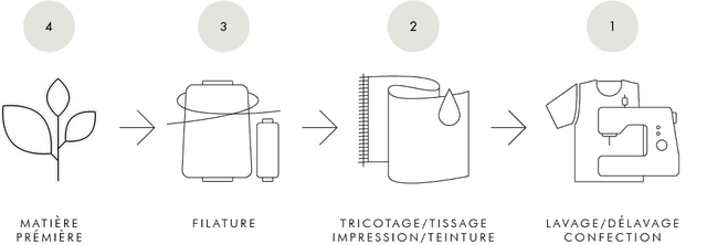 The garment manufacturing chain is made up of 4 main stages: production and extraction of raw materials, transformation of raw materials (spinning), weaving, knitting, dyeing or printing and finally garment manufacture. As a brand, we are in direct contact with clothing suppliers (tier 1) and sometimes with material suppliers (tier 2).