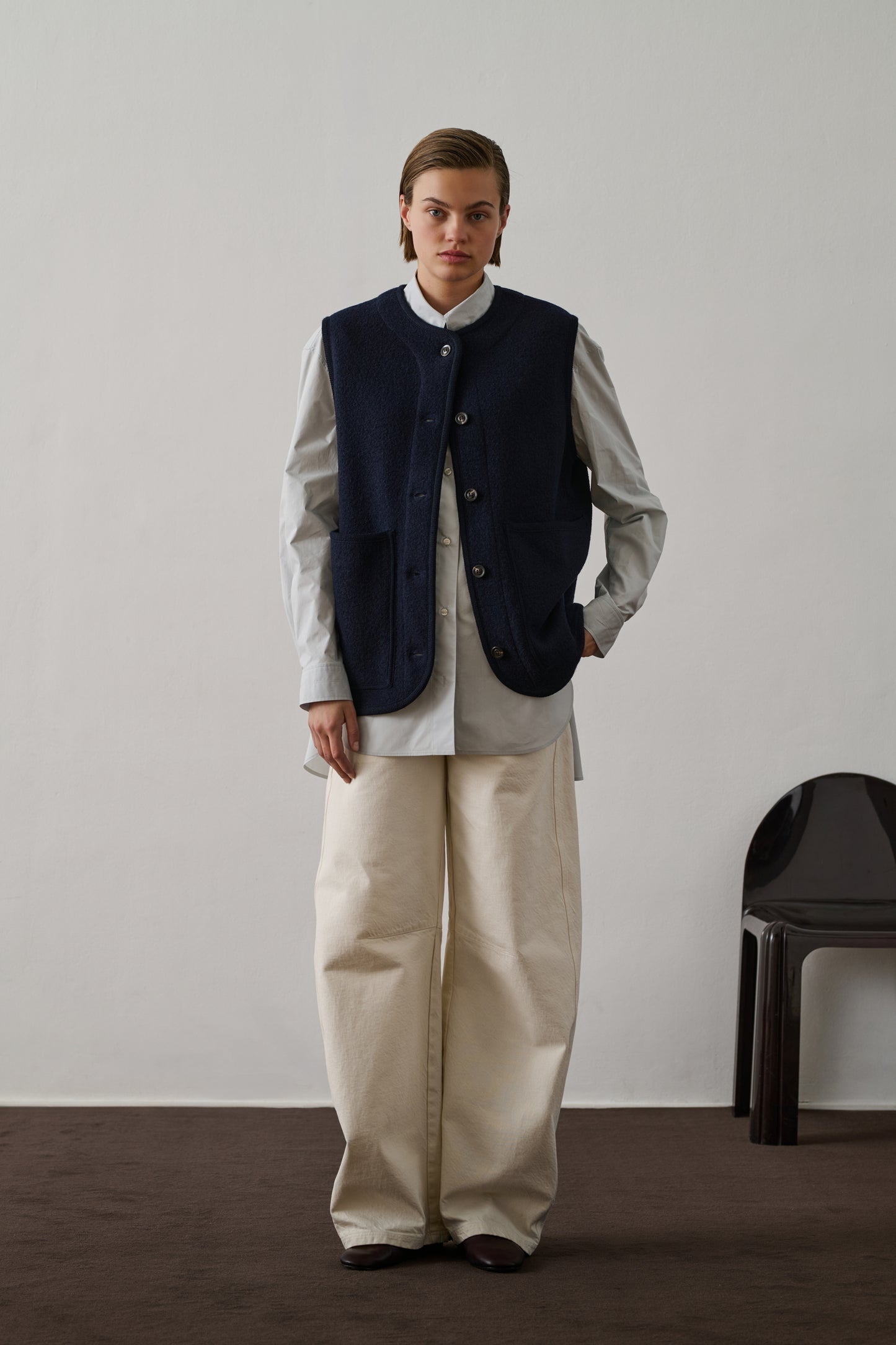 CHICAGO is a sleeveless jacket in boiled wool. This warm wool fabric ensures optimal insulation while being soft to the touch. It's designed like a vest that can be endlessly styled. Slip it under a coat without restricting movement, or layer it over a simple knitted jumper.