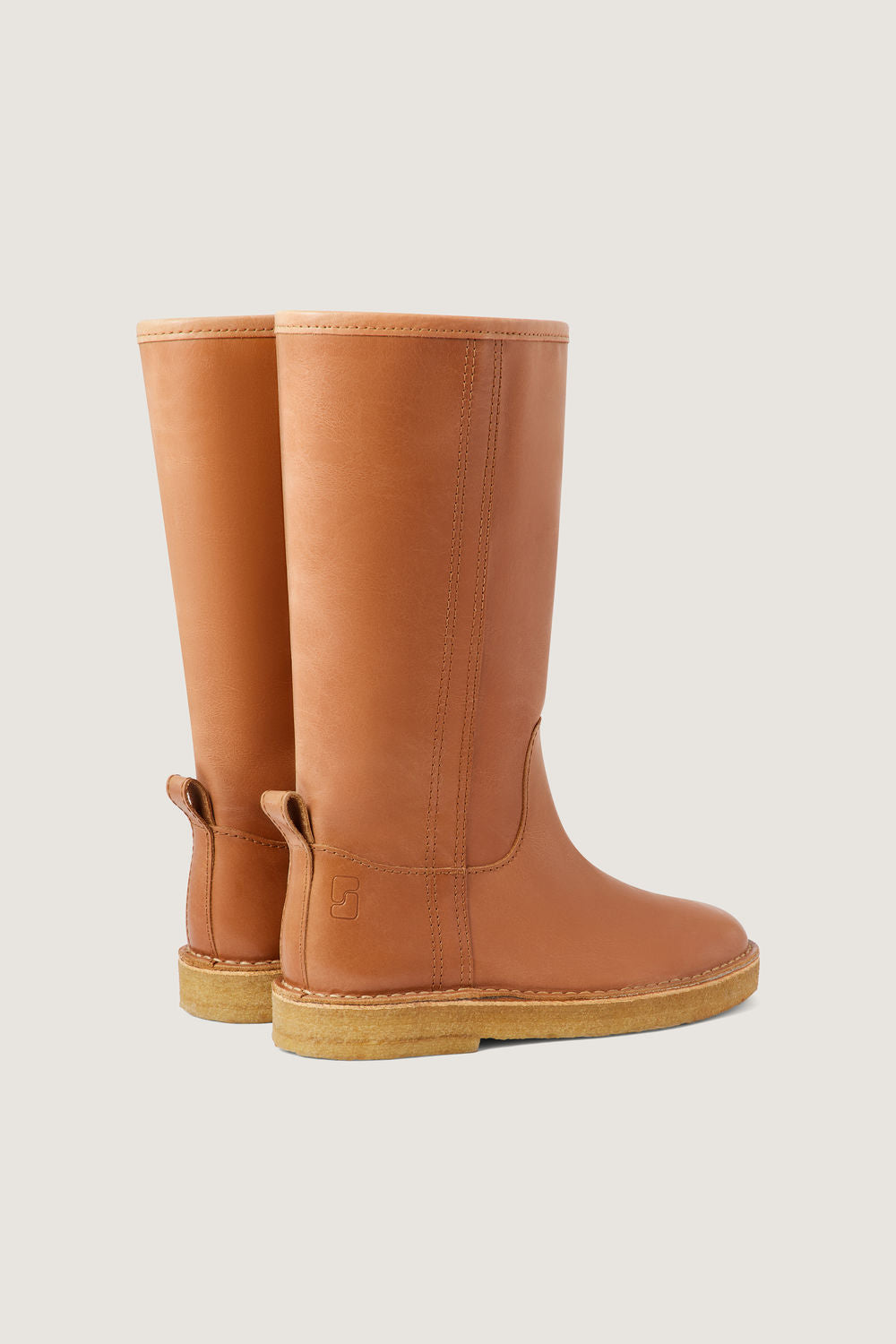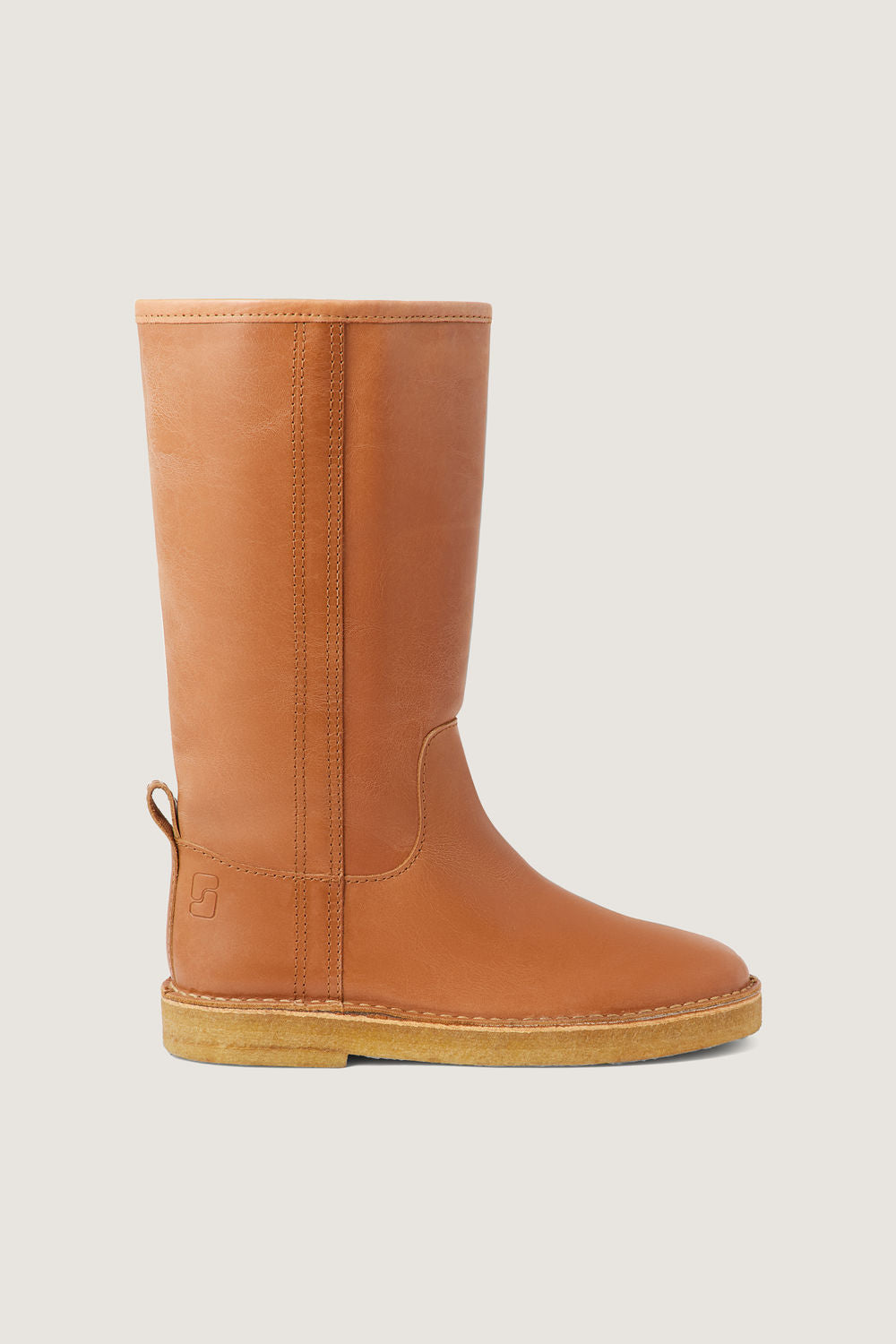 Cognac leather boots - Straight, wide slip-on boots- Thick crepe sole- Stem height 30cm- Heel height 3cm- Leather LWG