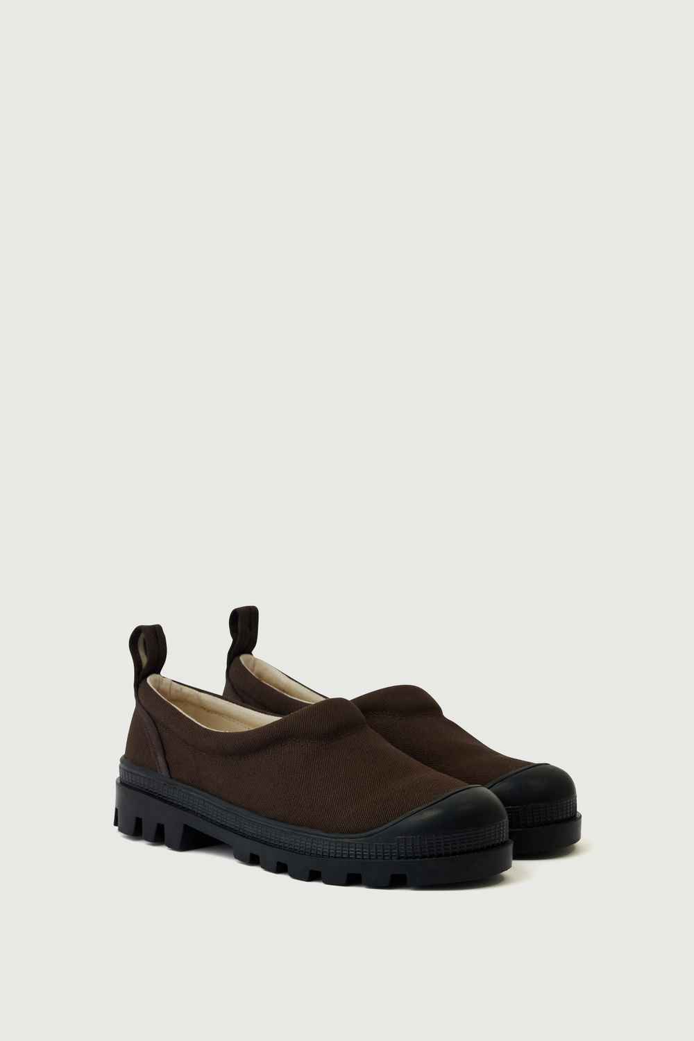 - Brown canvas ankle boots with black rubber tread soles