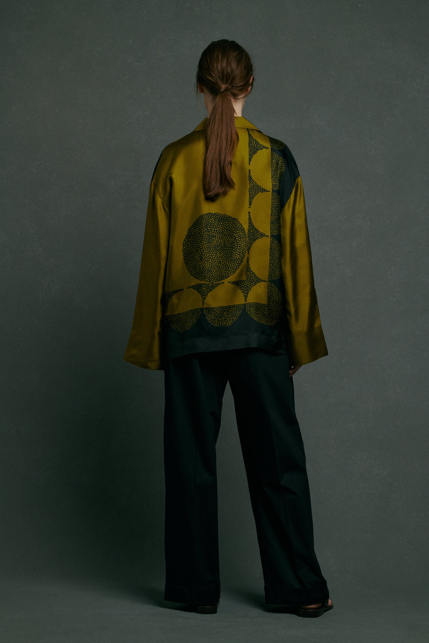 Loose-cut silk twill shirt with "Pochoir" print khaki