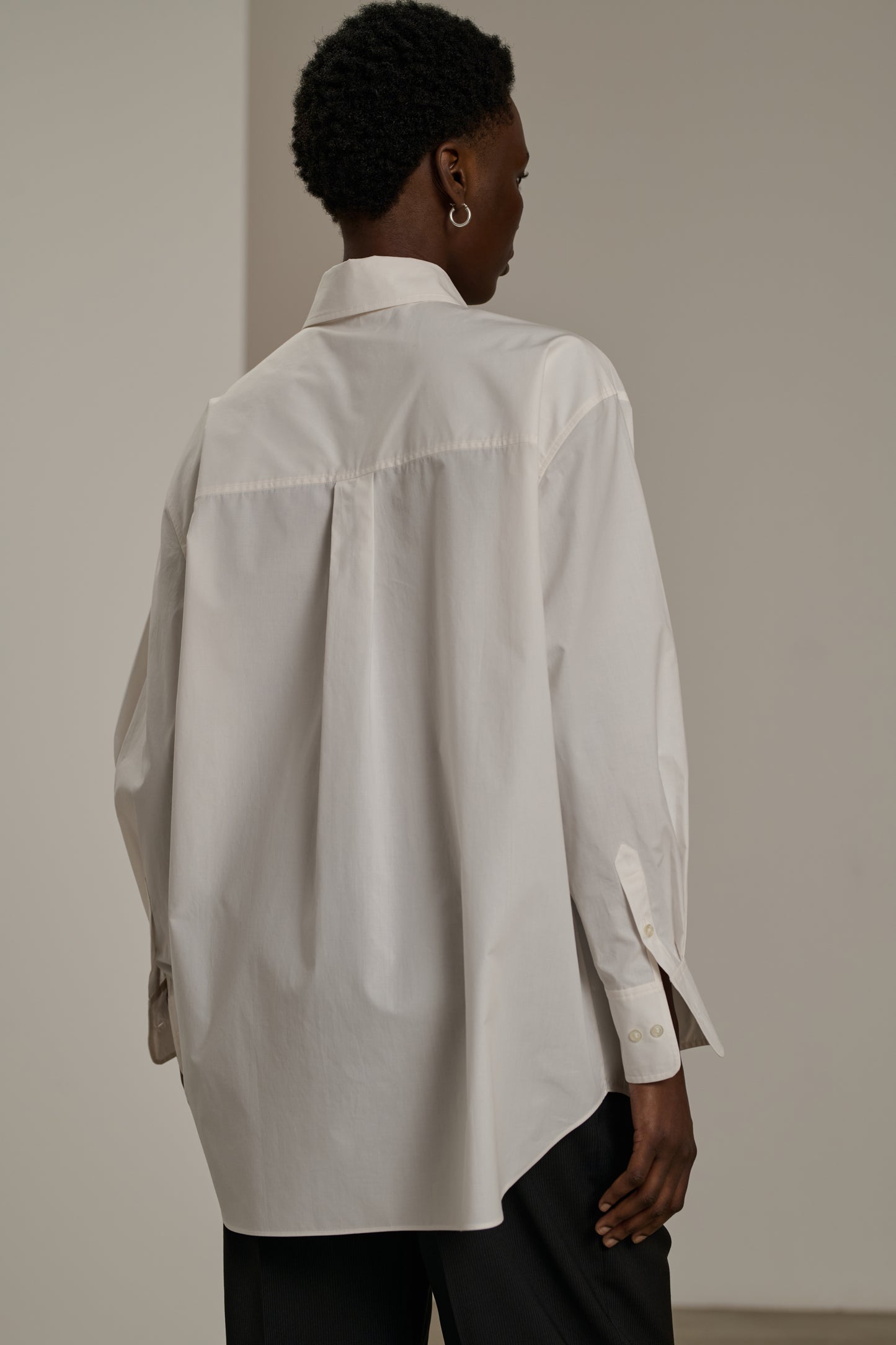 CARLOTTA is an off-white poplin shirt featuring an oversized fit inspired by men's wardrobes, offering a casual yet elegant style.