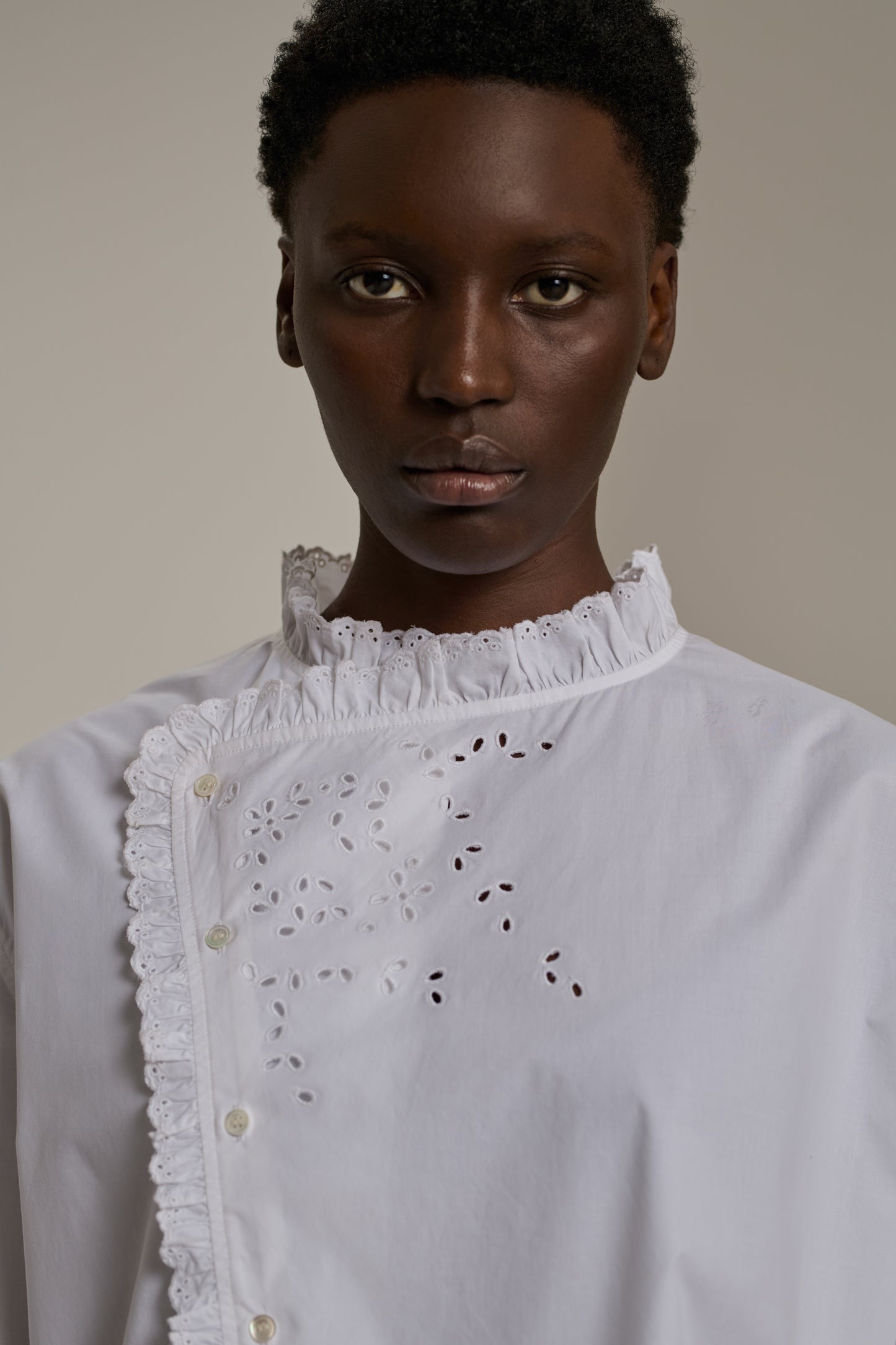 CLAUDIA is a straight-cut cotton poplin shirt. The buttoned opening at the collar, combined with a decorative placket, adds a distinctive and sophisticated touch, perfect for enhancing your everyday outfits.