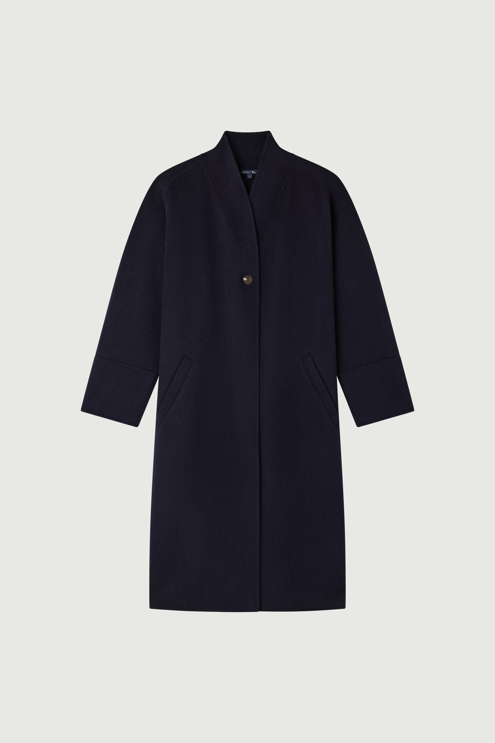 CESAR is a long coat crafted from double-faced wool blended with cashmere, offering a straight, elegant silhouette. It features a buttoned high collar with a visible button, which can also be worn folded down for versatile styling. The closure is secured with a removable belt. The wool and cashmere double face ensures warmth and softness.