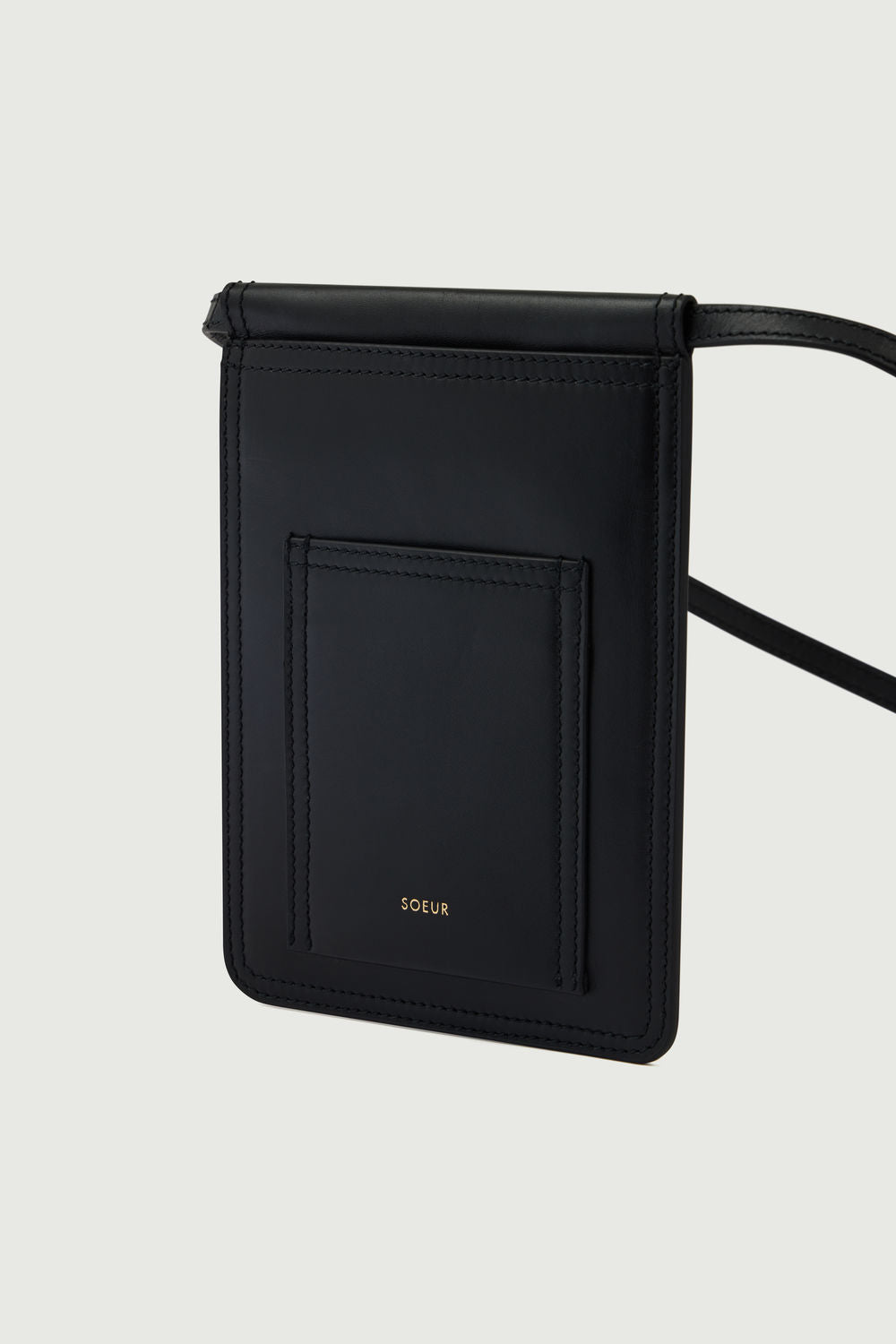 Smooth leather flat pouch with shoulder strap black